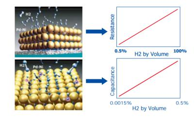 InsulDGA-H 套管油在線監測裝置使用新型的氫氣傳感技術--固態鈀合金薄膜傳感技術,固態鈀合金薄膜傳感器采用 Pd-Ni 合金等材料制成一種新型的敏感薄膜,基于鈀對氫氣的專一性催化原理,當套管油中存在氫氣時,氫氣分子被催化成 H 原子,吸附在